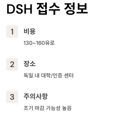 DSH 점수는 세 단계로 나뉘는데요, DSH 1은 B2, DSH 2는 C1, 그리고 DSH 3은 C2 수준이에요. 일반적으로 대학 입학에는 DSH 2 이상이 요구돼요. 시험은 재응시 제한이 없어서, 부담은 조금 덜한 편이에요.