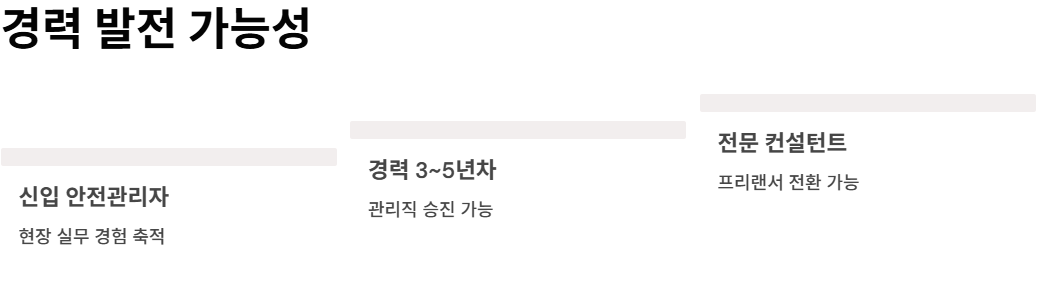 경력 3~5년차가 되면 관리직 승진도 가능해지고, 프리랜서 안전 컨설턴트로도 전환이 가능해요. “한 분야에 정착하고 싶다”는 분께 이보다 좋은 선택은 없을 거예요.