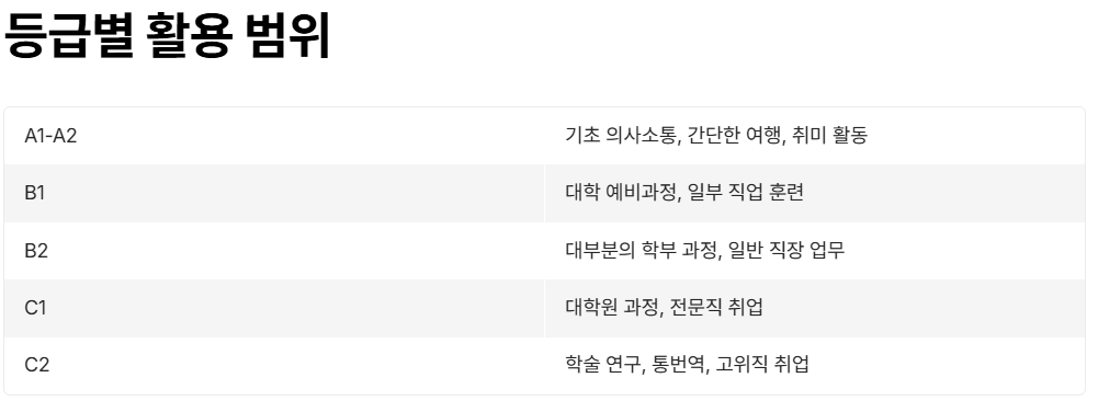 유학, 취업, 이민 등 다양한 목적에 활용되며, 국내 대학 졸업 요건이나 취업 시 가산점, 기업 인사 기준에도 사용됩니다. 특히 독일어권 국가에서 학업이나 근무를 계획하고 있다면 반드시 갖추어야 할 자격 중 하나입니다.